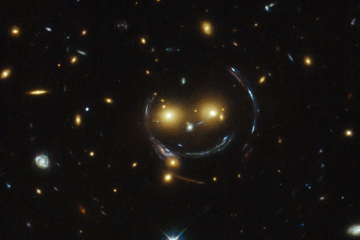Galaxy clusters are the most massive structures in the universe. They create such a powerful gravitational pull that they warp the space and time around them and act as cosmic lenses which can distort and bend the light behind them. In this case the Einstein Ring phenomena can be observed — it is a consequence of the exact and symmetrical alignment of the source, lens and observer. It happened that it resulted in the smile – like image.