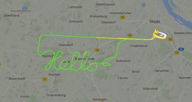Пилот частного самолета Robin проложил свой маршрут так, чтобы на карте отслеживания полетов получилось слово «Hello». Сервис Flightradar24 записал 37-минутный полет над немецкой Нижней Саксонией.
